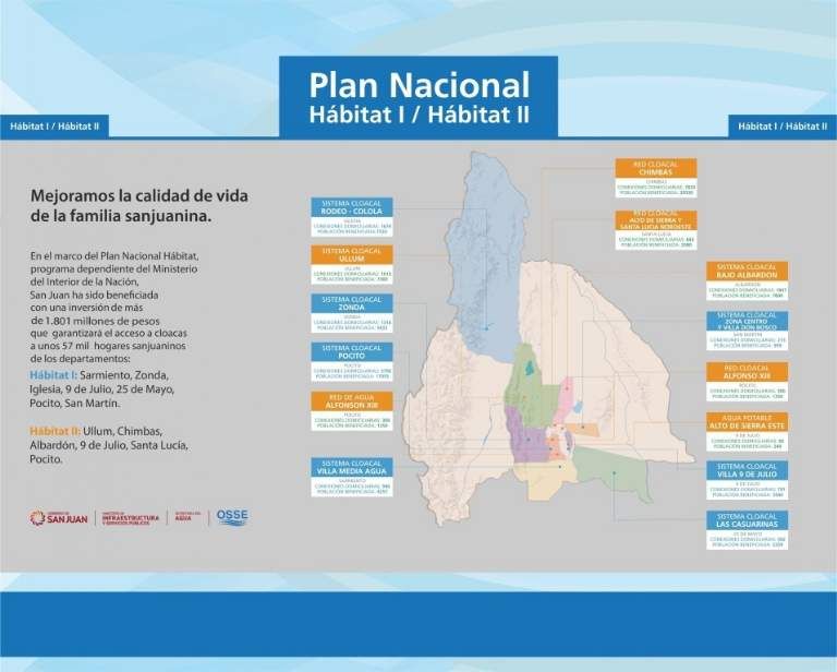 “Estamos orgullosos por lo que se está haciendo, pensando en que llevamos salud a las personas”, dijo el presidente de OSSE, Sergio Ruiz, al hablar del Plan Director de Agua y Saneamiento que prevé dejar una cobertura histórica en San Juan para 2020: prevén sumar 7% más de beneficiarios de agua potable llegando al 99% de cobertura, y sumar 40% de beneficiarios de red cloacal llegando a 86% de cobertura, lo que hará a San Juan el distrito que llegará primero e incluso superará la meta nacional de 85%, según dijo el funcionario.