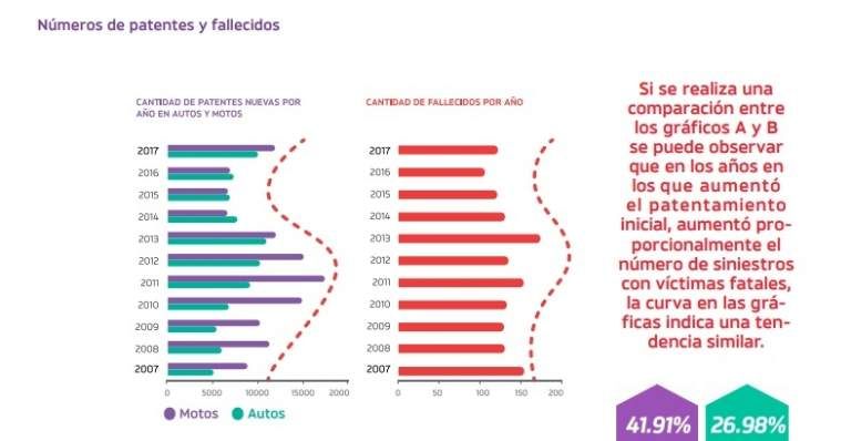 En el año 2017 se produjo un incremento considerable en la incorporación de nuevas unidades, ya que si se compara con el año 2016, se realizaron 41.92% de patentes iniciales más que el año anterior en motocicletas y 26.98% de patentes iniciales en automóviles más que el año anterior. Números de patentes y fallecidos En el año 2017 hubo un incremento considerable con nuevas unidades, principalmente en motos, pero si bien esto se vio reflejado en los siniestros, no lo hizo en la misma proporción en los incidentes con fallecidos como en años anteriores.