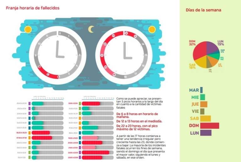 Se presentan 3 picos horarios a lo largo del día en cuanto a la cantidad de víctimas fatales: de 6 a 8 horas en horario de mañana, de 12 a 13 horas en el mediodía y de 22 a 23 horas, con el pico máximo de 12 víctimas. A partir de las 17 horas comienza a tener una tendencia irregular pero creciente hasta las 23, donde comienza a bajar. La mayoría de los incidentes fatales ocurren los fines de semana, siendo el domingo el día que presenta el mayor valor, siguiendo el lunes y sábado, en ese orden.