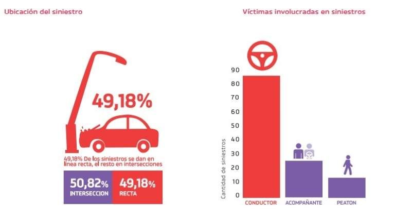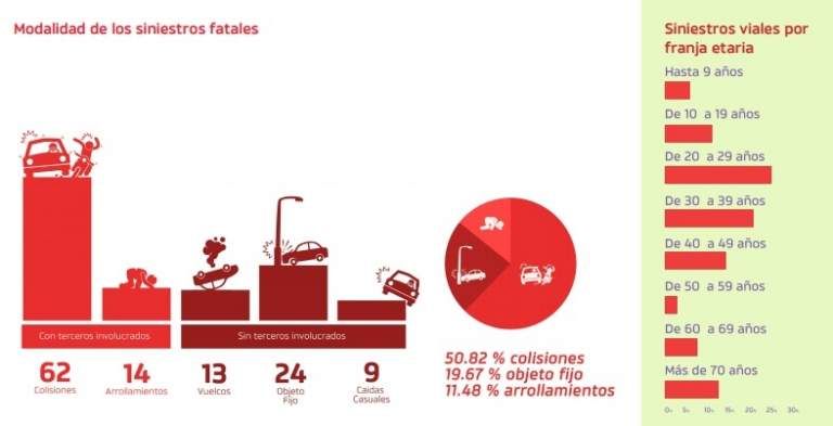 El 51.64% de los siniestros con personas fallecidas tuvo como protagonista una moto. Si bien en muchos casos también estuvieron involucrados con otros vehículos, las víctimas fatales utilizaban las motos como medio de transporte, sea como conductor o acompañante. En segundo lugar se encuentran los automóviles (19,67% del total) como principal medio de transporte involucrado en siniestros con víctimas fatales. En tercer lugar están las bicicletas, que representan el 11.48% de los incidentes. En el caso de peatones, los siniestros corresponden a arrollamientos con autos, camionetas, ómnibus, y otros vehículos. Del total de unidades registradas, sólo el 0,03% se vio involucrado en siniestros con víctimas fatales.