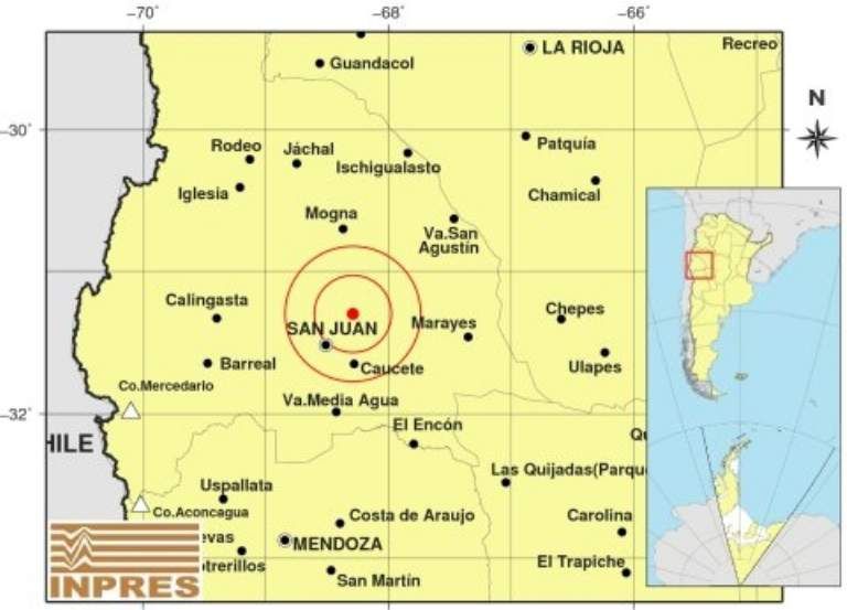 Epicentro: 31 km al NE de San Juan, 182 km al N de Mendoza, 39 km al N de Caucete. -31.300 (lat) -68.290 (long)