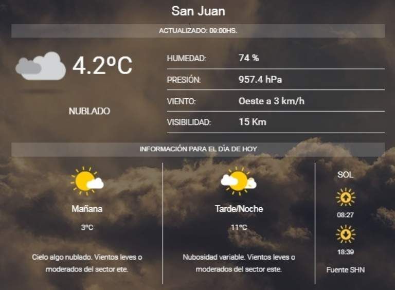 Según informó el Servicio Meteorológico Nacional, la temperatura para este sábado continuará siendo baja como sucedió en los últimos días y por ello el pronóstico extendido informa que la mínima será de 3 y la máxima de 11 grados.