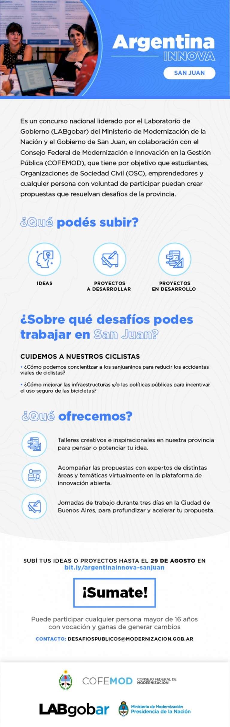 El Gobierno de San Juan es parte del concurso Argentina INNOVA: una iniciativa nacional lanzada por el Laboratorio de Gobierno (LABgobar) del Ministerio de Modernización de la Nación en colaboración con el Consejo Federal de Modernización e Innovación en la Gestión Pública (COFEMOD).