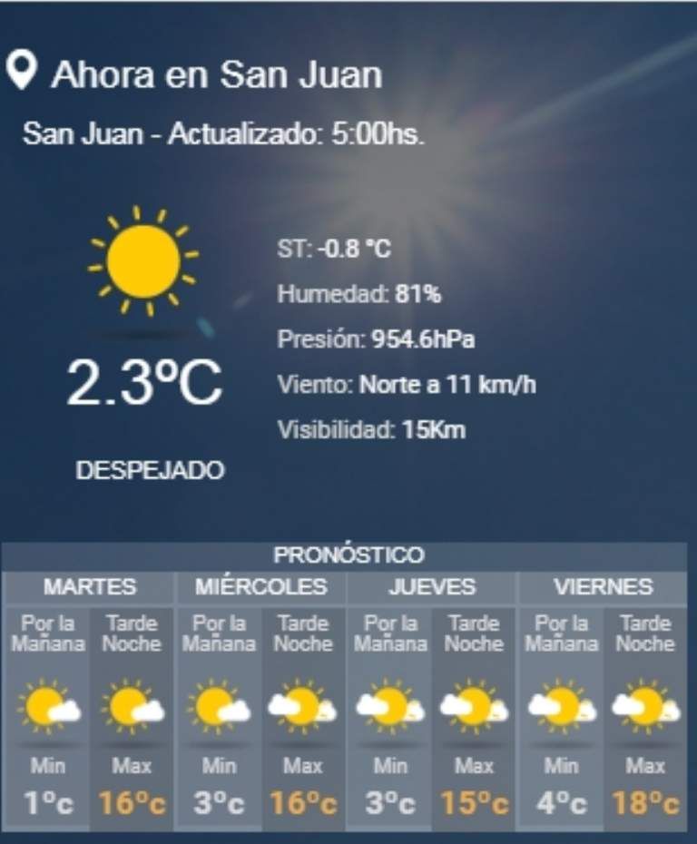 El Servicio Meteorológico Nacional pronostica para este martes una temperatura máxima de 16º y una mínima de 1º.
