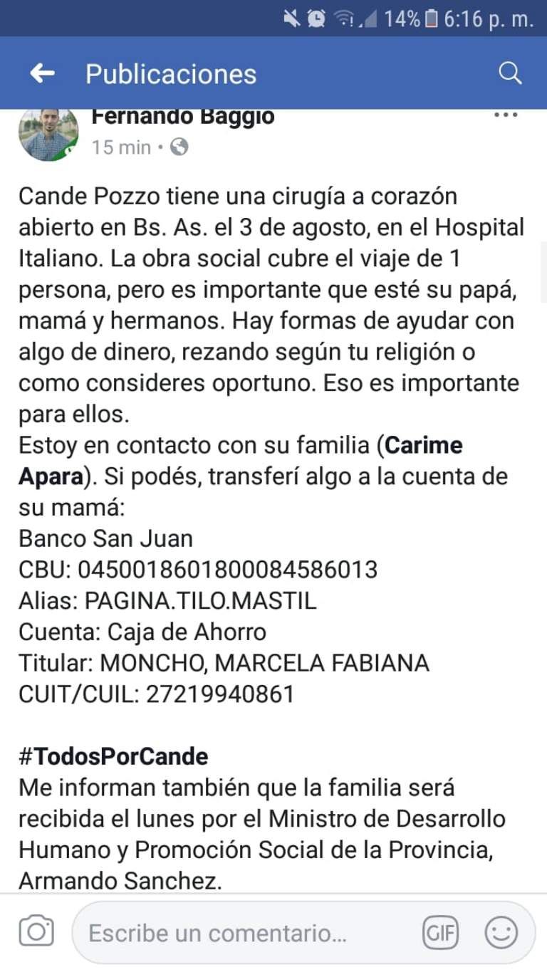 La historia llegó a los medos después de que su prima Carime Apara publicara en su cuenta de Facebook una venta de frascos con golosinas para ayudar con algo de dinero a sus tíos y tras viralizarse muchos sanjuaninos se metieron de lleno con la causa, incluso el mismo Fernando Baggio, que fue noticia esta semana por una cuestión de salud también.