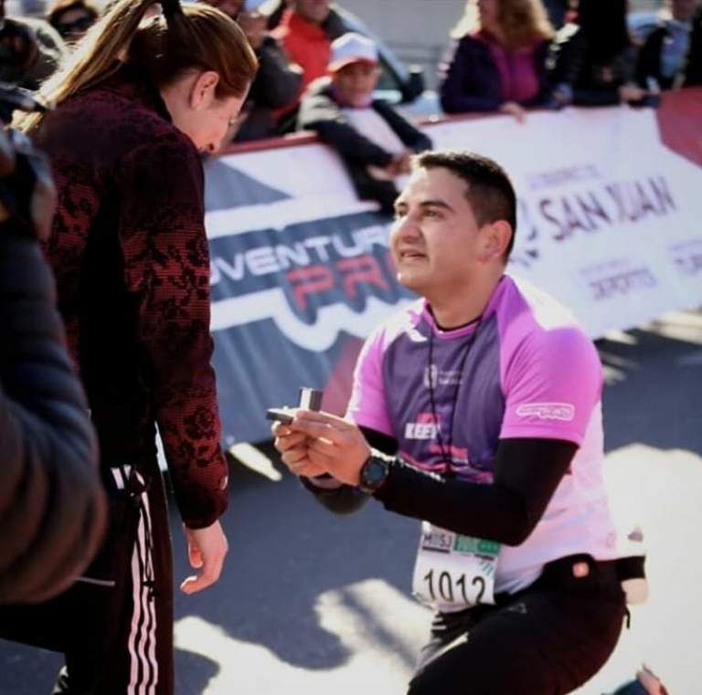 Claudia estaba en la carrera y desbordó de alegría, más cuando el corredor la tuvo frente a él, se arrodilló y volvió a hacerle la propuesta.