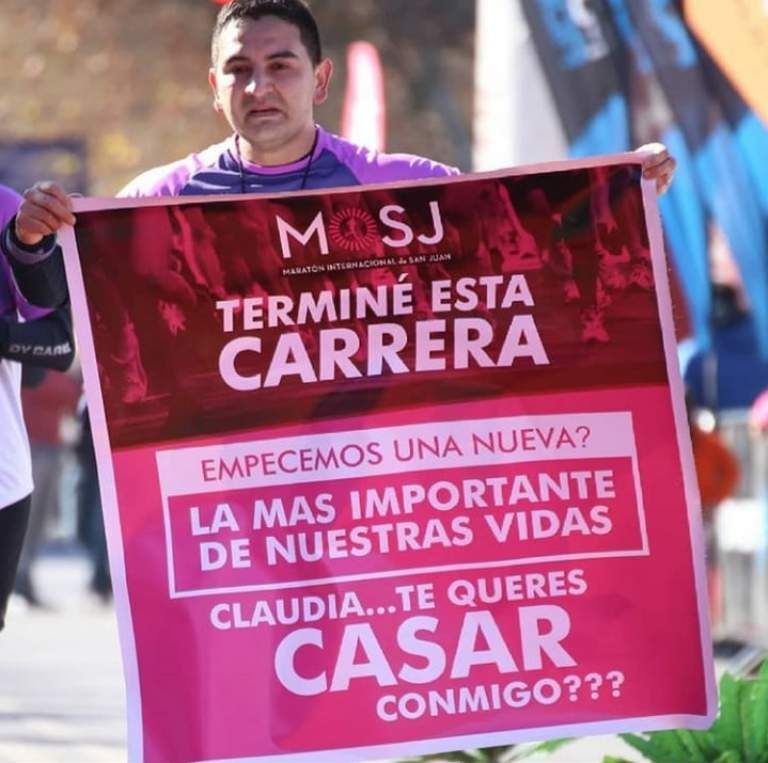 Es que cuando llegaba a la línea de meta tras culminar la carrera desplegó un enorme cartel con la frase: “Terminé esta carrera, empecemos una nueva? La más importante de nuestras vidas. Claudia, te querés casar conmigo?”.