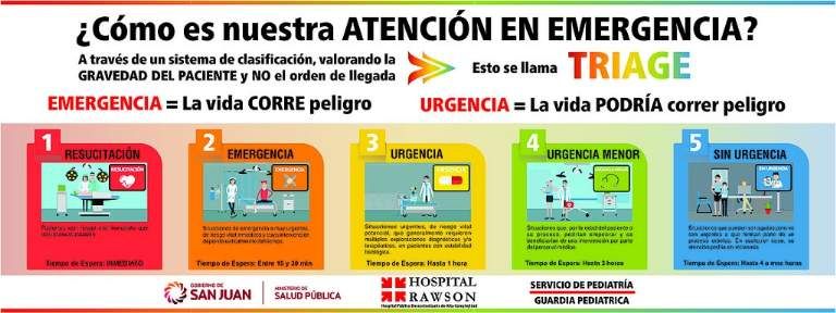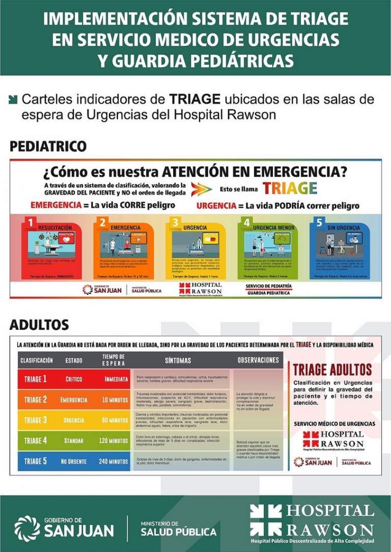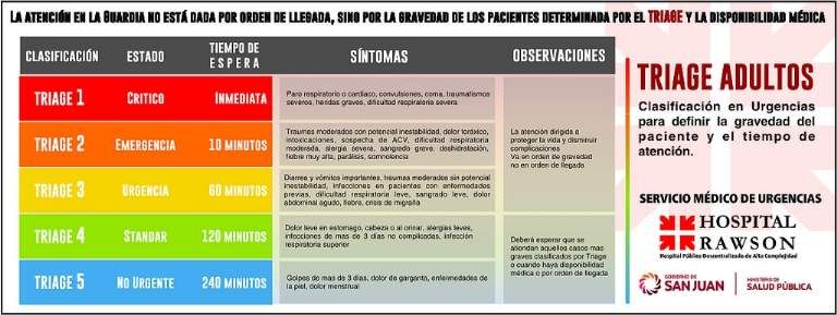La atención de las Guardias de Urgencias Adultos y Pediátricos del hospital Rawson se regirá por el Sistema Internacional de Triage, en el cual la atención está dada por la gravedad de los pacientes ingresantes y la disponibilidad médica del servicio, y no por el orden de llegada.