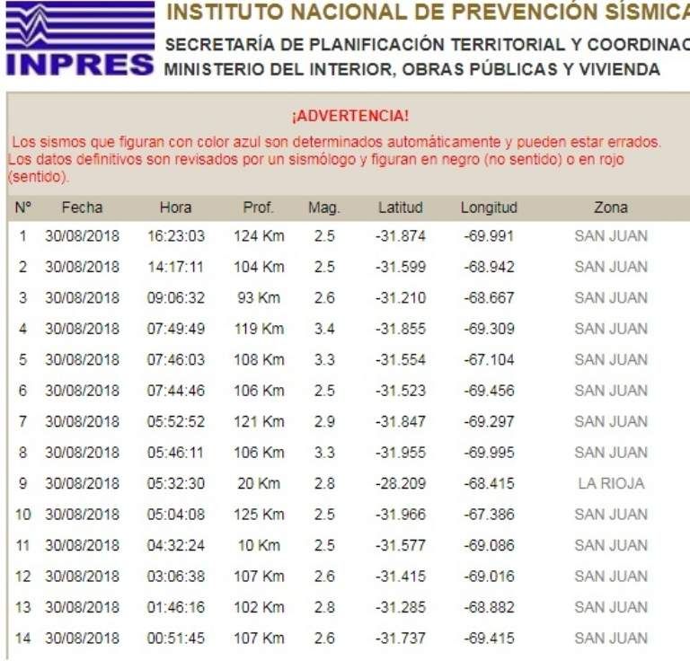 El jueves fue movidito para la provincia de San Juan. Durante la jornada, según el Instituto Nacional de Prevención Sísmica, se registraron 14 movimientos sísmicos con diferentes profundidades y magnitudes. Las sacudidas se produjeron entre las 00.51 y 16.23 horas, incluso hubo una seguidillas de 3 que se dieron entre las 7.44 y 7.49 horas.