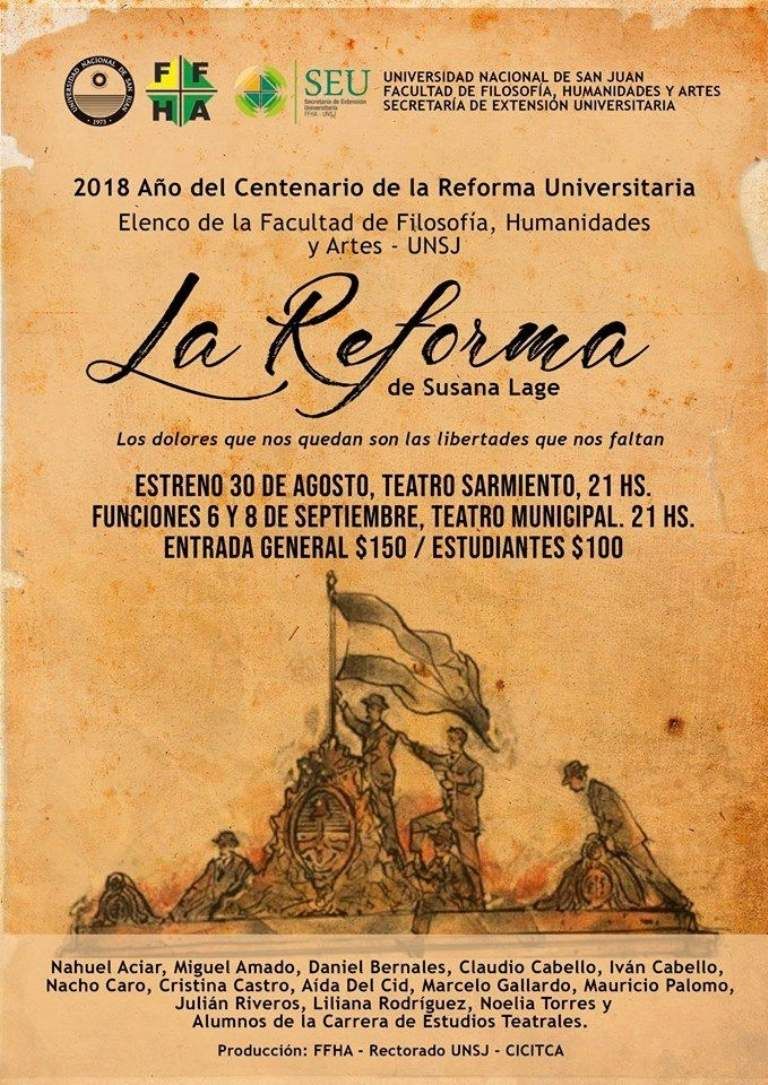 Con el sello de Susana Lage, se presentará en San Juan la obra de teatro La Reforma, con la que se recordarán los 100 años de la Reforma Universitaria en el país.