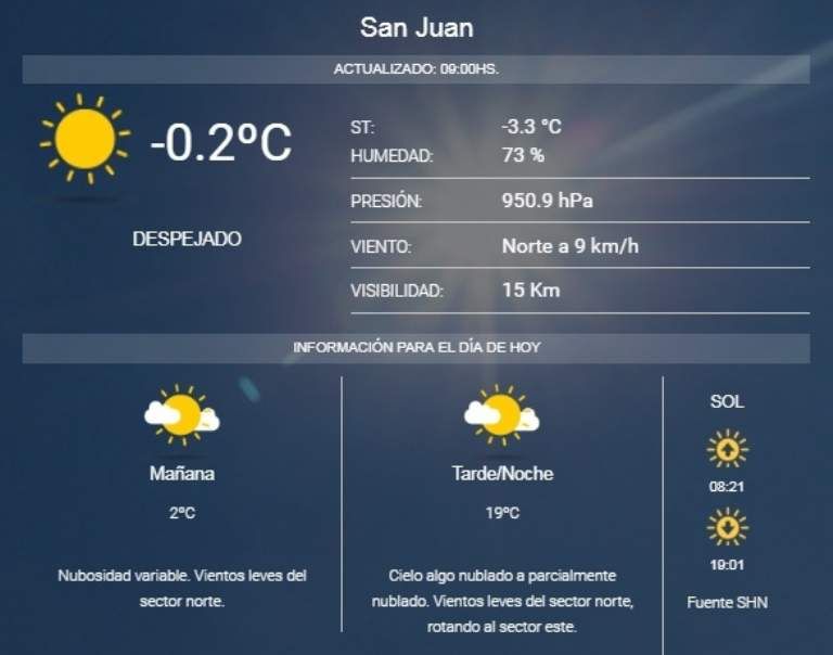 SUSCRIBITEEste sábado, el viento dirá presente en San Juan y enfriará la tarde sanjuanina, según avisa el Servicio Meteorológico Nacional, que también informa que la temperatura mínima será de 2º y la máxima de 19º.