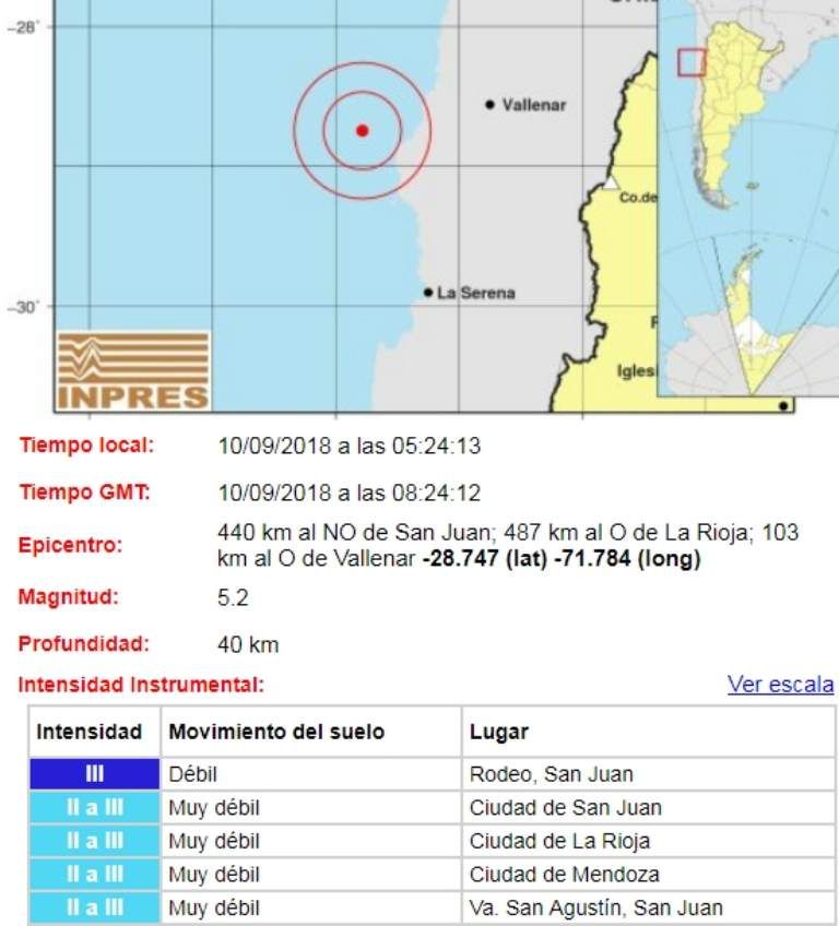 Según informó el INPRES, el temblor alcanzó una magnitud de 5.2º en la escala de Richter y en Rodeo, Iglesia, se percibió con una intensidad de grado III en la Escala Mercalli Modificada, considerado como "movimiento de suelo débil". Con menor nitidez se percibió en la Ciudad de San Juan, en La Rioja y en Mendoza, además de Villa San Agustín, en Valle Fértil.