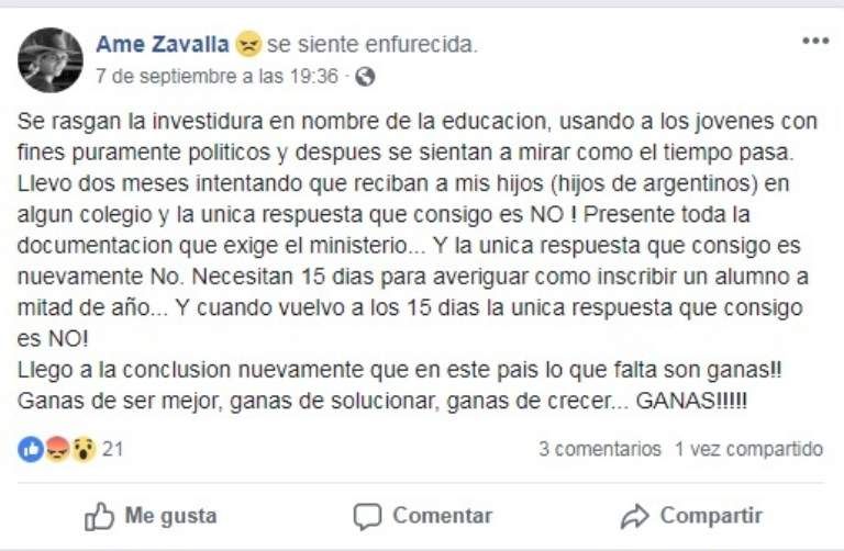 La madre de Nahuel y Lourdes expresó su preocupación: “Estoy cansada. Entre el Ministerio y las escuelas se tiran la pelota. Junté toda la documentación y desde los establecimientos educativos siempre me ponen un pero. Que no hay lugar, que tiene que rendir materia fuera del cursado, que van libre. En Estados Unidos es al revés, reciben a los chicos para que cursen y después se fijan en la documentación”.