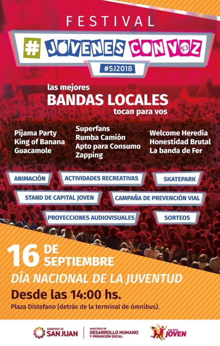 Para celebrar el día nacional de la juventud, Desarrollo Humano organizó u festival de música gratuito que contará con la presencia de las mejores bandas sanjuaninas en un escenario ubicado en la Plaza Distéfano, detrás de la Terminal de Ómnibus, en Capital.