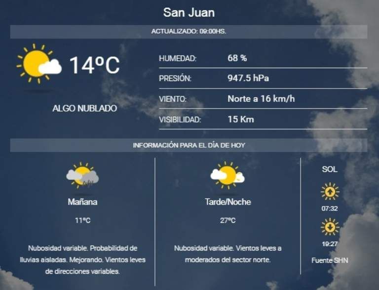 Acorde los datos del Servicio Meteorológico Nacional, San Juan tendrá este domingo un día soleado, acompañado de vientos leves de direcciones variables. Sin embargo, la presencia de nubes y de algunas lluvias aisladas se dará en el territorio.