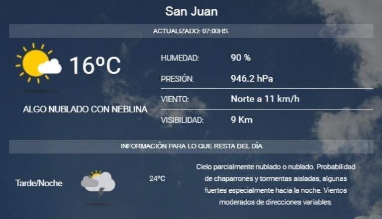 Para la jornada de este martes, en San Juan salió el sol después de dos días de lluvia, sin embargo -según informa el Servicio Meteorológico Nacional- las lluvias no se irán y podrían reaparecer sobre la tarde noche. La máxima temperatura alcanzará los 24º (con posibilidad de ascenso) y la mínima de 16º.