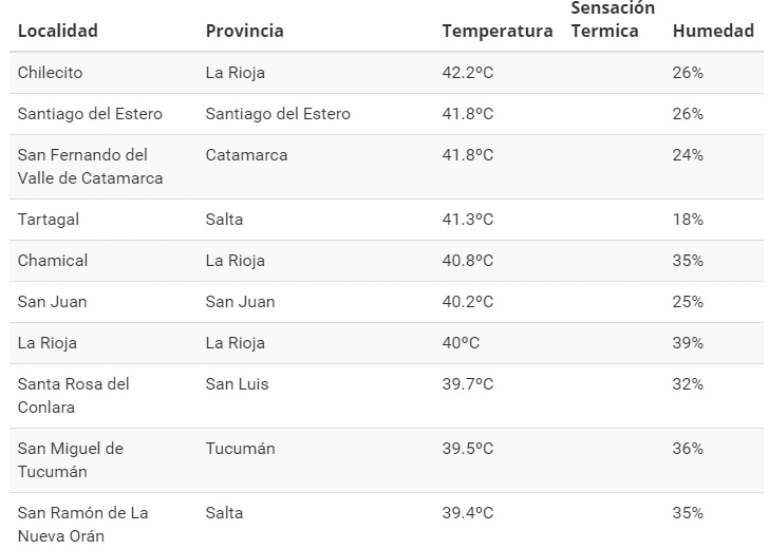 La ola de calor que afecta a buena parte del país no se detiene. El registro del Servicio Meteorológico Nacional de las 16.00 ubicó a San Juan en la sexta posición de las ciudades más calientes con 40,2º. Chilecito, en La Rioja, se ubicó en la primera posición con 42,2º.