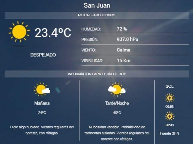 Con una máxima de 40º, San Juan será una de las provincias más calurosas del país este martes que para el final de la jornada, según informa el Servicio Meteorológico Nacional, las temperaturas descenderían por algunas precipitaciones y vientos de direcciones variables.