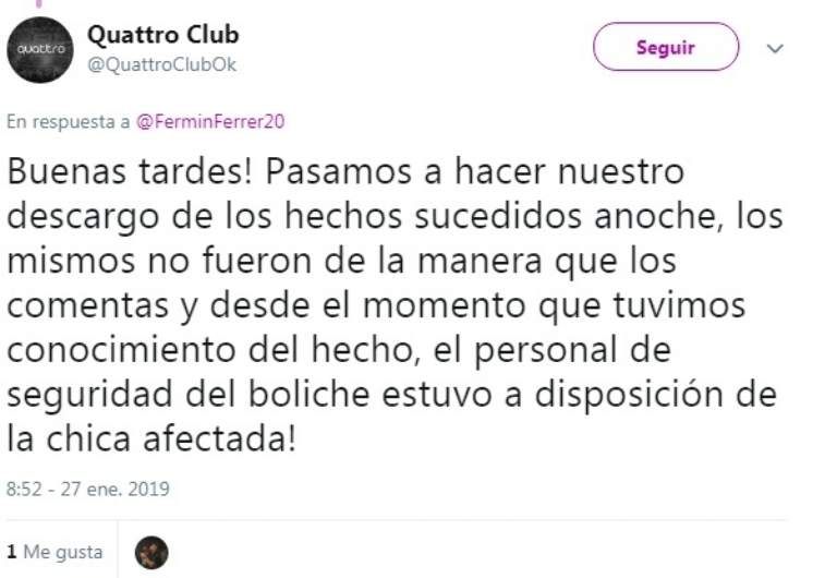 Por su parte, desde el boliche en sus cuentas de Twitter y en Facebook aclararon que sí se preocuparon por el estado de salud de Berardi e incluso afirmaron que ofrecieron el servicio de una ambulancia y ella se habría negado. "Se negó a ser atendida”, sostuvieron.
