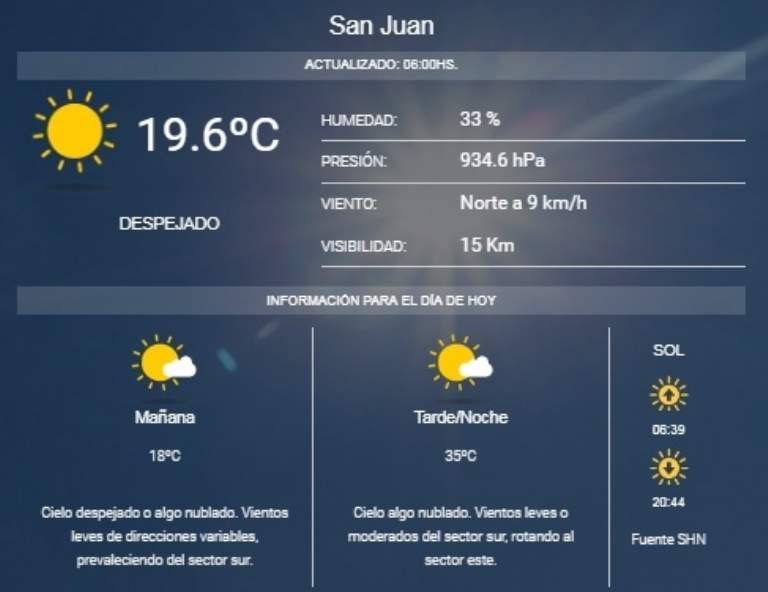 Según informa el Servicio Meteorológico Nacional, las temperaturas para este martes serán altas y la máxima alcanzará los 35º. Con el cielo despejado desde bien temprano, el sol y la humedad serán el cóctel ideal para el calor al que afrontarán los sanjuaninos durante la jornada.