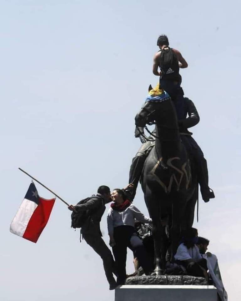 Chile ha estado en el centro de la escena mundial por las multitudinarias protestas en las últimas semanas que piden la renuncia del presidente Sebastián Piñera. En este marco, apareció una fotografía de una típica estatua de un prócer a caballo pintada con aerosol con lo que parecería ser la sigla “CSD” correspondiente al Club Sportivo Desamparados. ¿Será eso o será otra cosa?