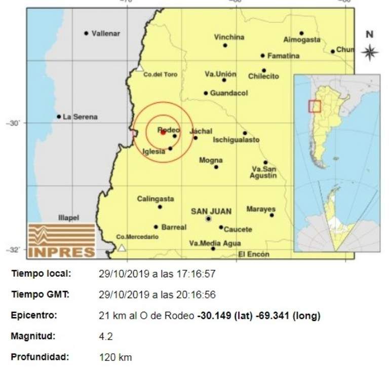 Un fuerte sismo ocurrió durante las 17:16 de este martes a 21 kilómetros al oeste de Rodeo, Iglesia. Fue de 4,2 grados y, según publicó el INPRES, se sintió en algunos lugares turísticos de la provincia como Bella Vista, Rodeo, Las Flores y San José de Jáchal.
