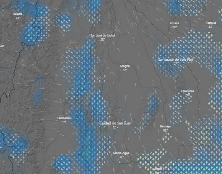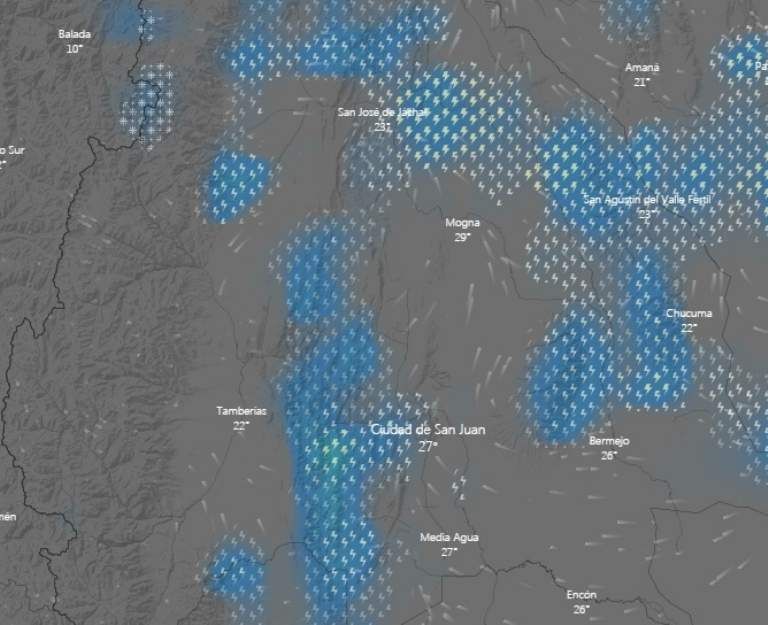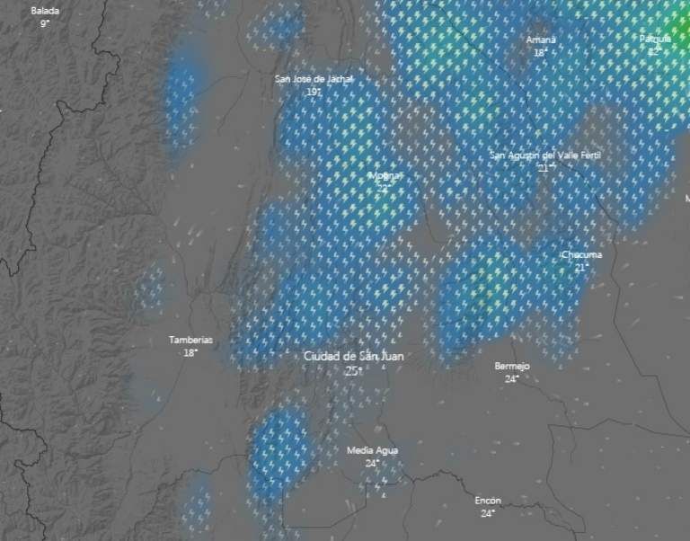 Tal como anunciaban todos los pronósticos, este martes el cielo sanjuanino se pobló de nubes. En la mayoría del territorio provincial está lloviendo, mientras que en otros pocos lugares se está haciendo esperar. Cuando el reloj marcó las 17 en San Juan, llovía en distintos departamentos: Sarmiento, Calingasta, Zonda, Ullum, San Martín, Caucete, Valle Fértil, 25 de Mayo, Jáchal e Iglesia. Donde todavía no se registraban precipitaciones es en la zona del Gran San Juan.