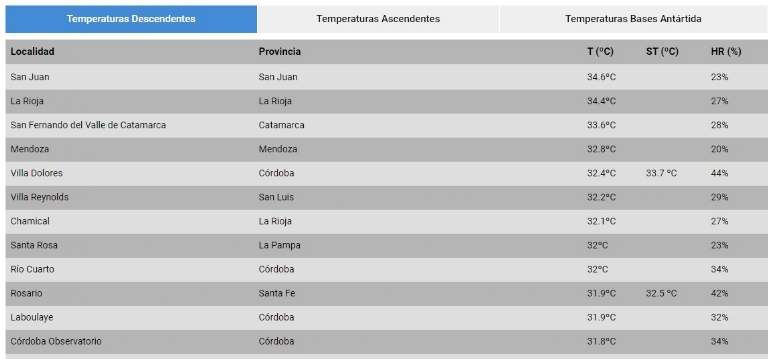 Con 34,6º, la temperatura en San Juan a las 17 de este miércoles fue la más alta en todo el territorio Argentino. Según el Servicio Meteorológico Nacional, la siguieron La Rioja, Catamarca y Mendoza. Por ahora, se espera que el calor se instale hasta la noche, con una temperatura que rondará los 26º a la medianoche.