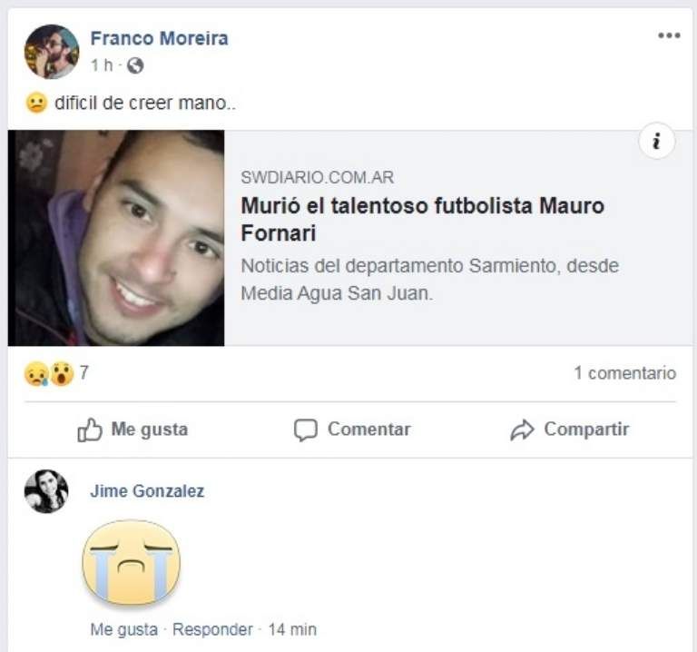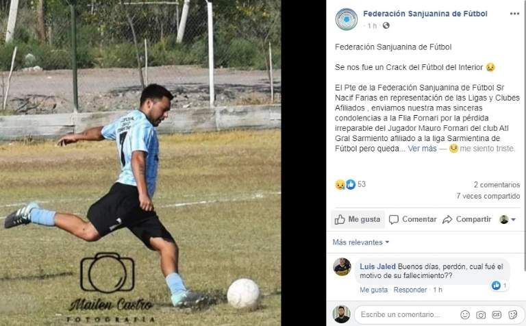 Esta será una triste Navidad para la familia Fornari de Sarmiento, debido al fallecimiento de Mauro Fornari, jugador de fútbol del departamento sanjuanino. El deportista jugaba en el Club Atlético Sarmiento y fue hallado sin vida en el fondo de la casa de su abuelo.