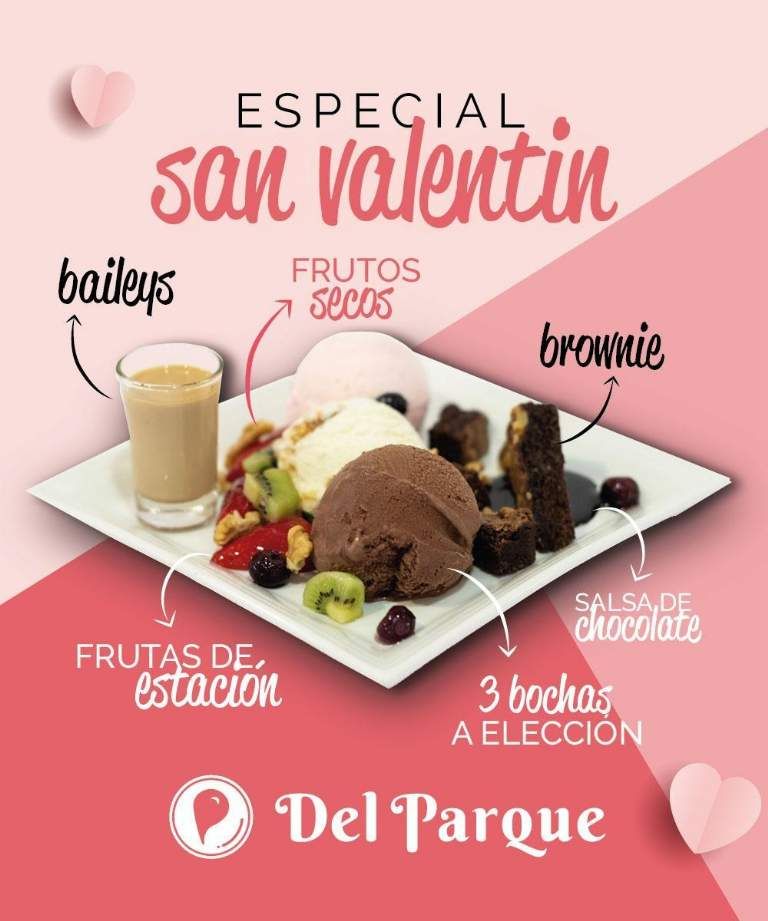 Si además querés compartir algo dulce con tu pareja en una de las sucursales, Del Parque presentó un plato especial que tiene tres bochas de helado a elección, brownie, salsa de chocolate, frutas de estación frescas, frutos secos y licor baileys.