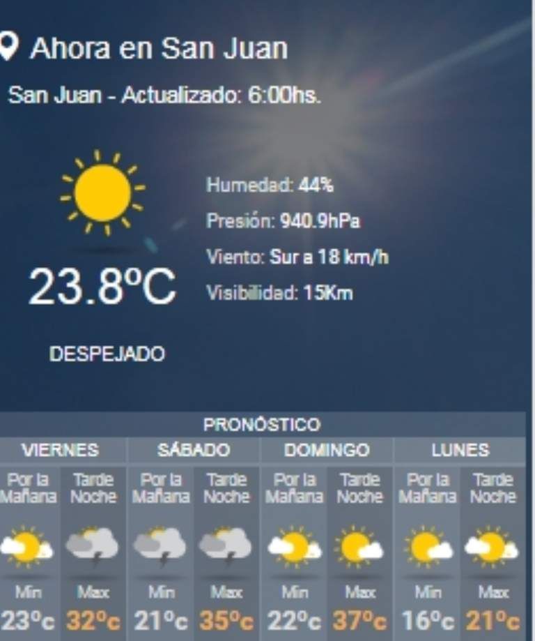 El Servicio Meteorológico Nacional pronostica para la jornada de este viernes una temperatura máxima de 32º y una mínima de 23º.