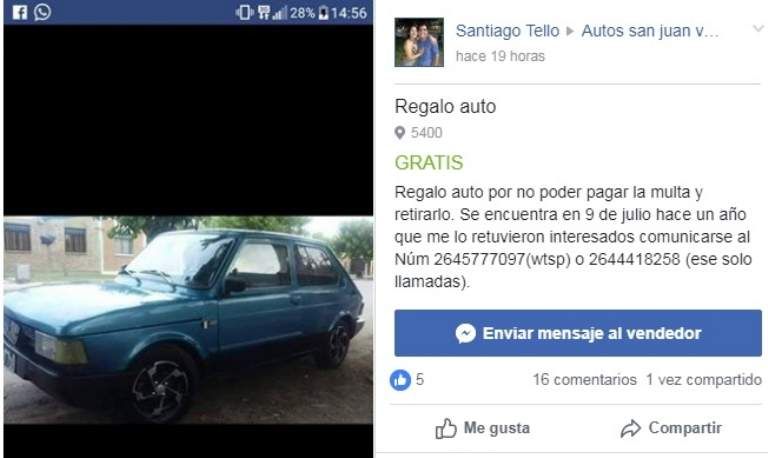 Un sanjuanino sorprendió por las redes sociales al ofrecer su auto de manera gratuita. Se trata de Santiago Tello quien afirmó que regalará el auto ya que no puede pagar la multa para retirarlo del depósito de 9 de Julio donde lo tiene desde que se lo remolcaron.