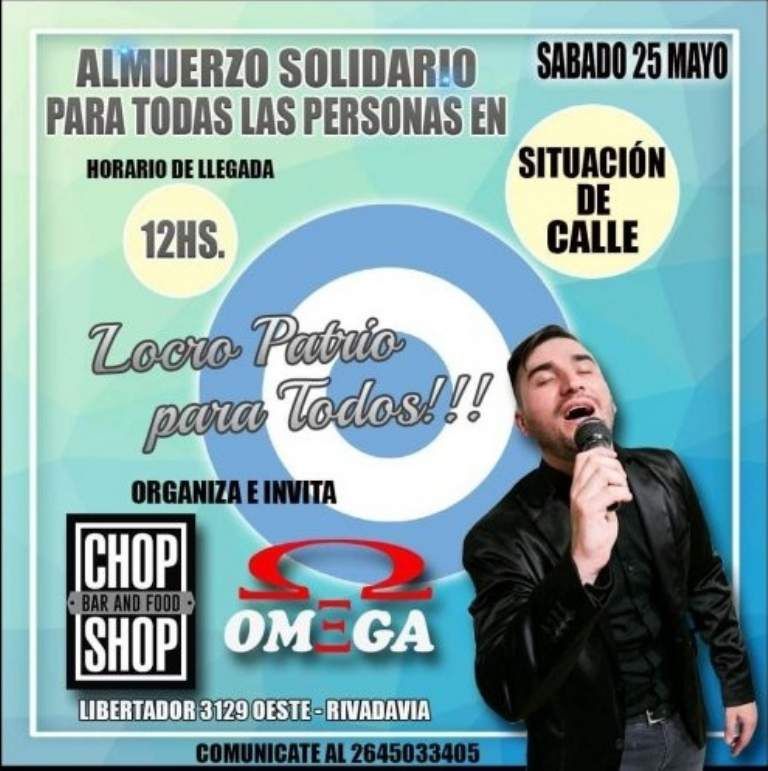 El próximo sábado 25 de mayo el grupo de cuarteto Omega realizará un evento solidario de manera conjunta con el bar Chop Shop, en donde se le dará un plato de locro caliente a aquellas personas que estén en situación de calle. La cita esta programada a partir de las 12 del mediodía en Avenida Libertador 3129 (oeste) y es solamente para aquellas personas que estén en esa difícil situación. La idea del evento "fue de los hermanos Flores, con Gustavo el dueño del bar y en general nos surge porque nosotros estamos siempre en la calle, de noche y vemos como está difícil la situación" afirma Ricardo Golo Abrego, el baterista del conocido grupo sanjuanino.