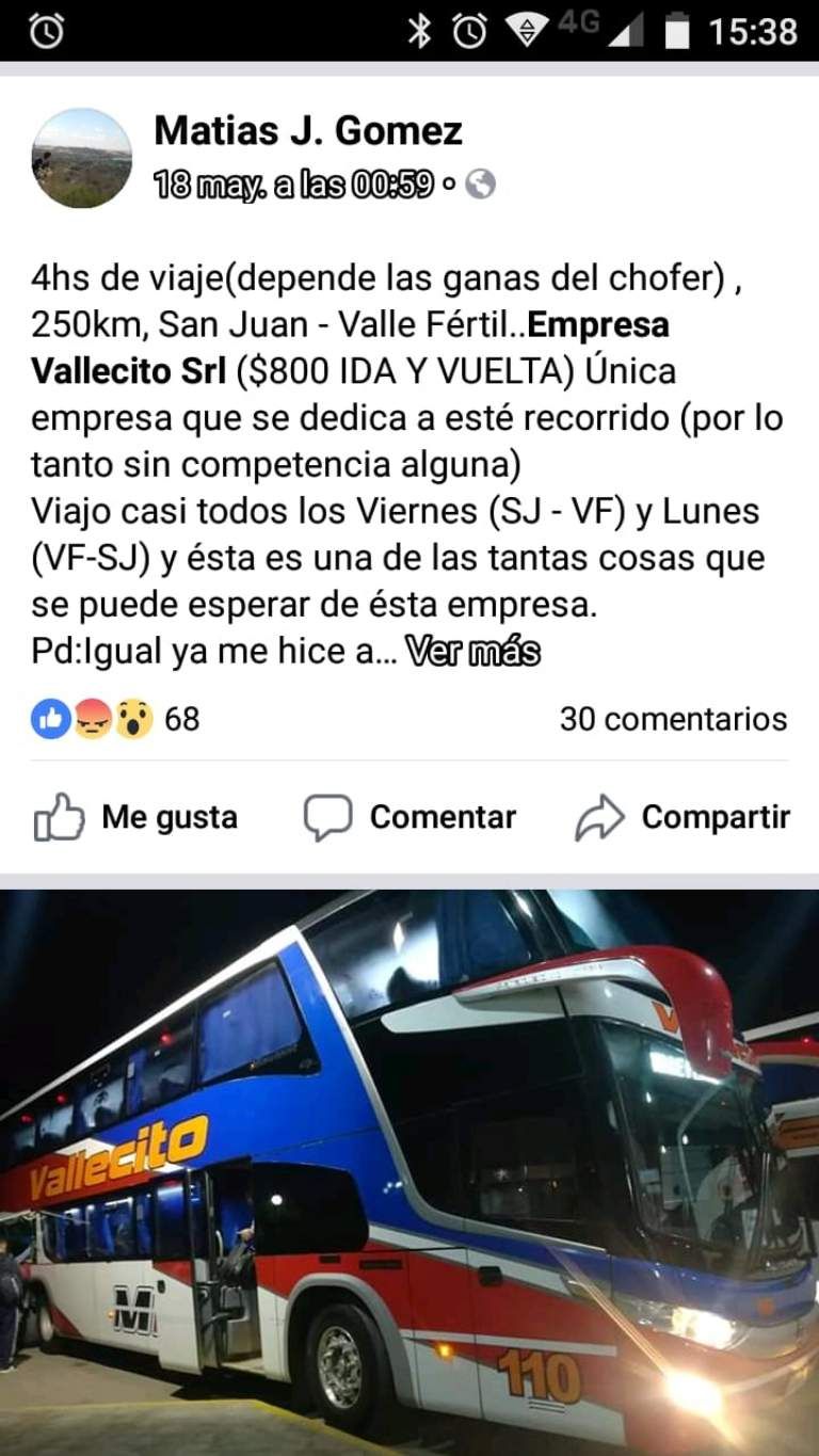 A través de las redes sociales, un pasajero de la empresa Vallecito -el único transporte que realiza viajes a Valle Fértil- publicó un video del colectivo invadido por cucarachas. Molesto por las condiciones en las que se encontraba la unidad en la que viajaba, realizó la denuncia pública en su cuenta de Facebook.