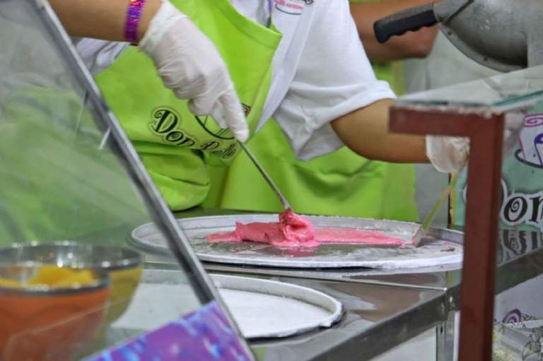 El que pasó por ese stand siempre se paró y la mayoría terminó comprando. Se trata del helado a la plancha, también conocido como tailandés, que la elabora unos emprendedores sanjuaninos y que es furor en la Feria de las Artesanías.