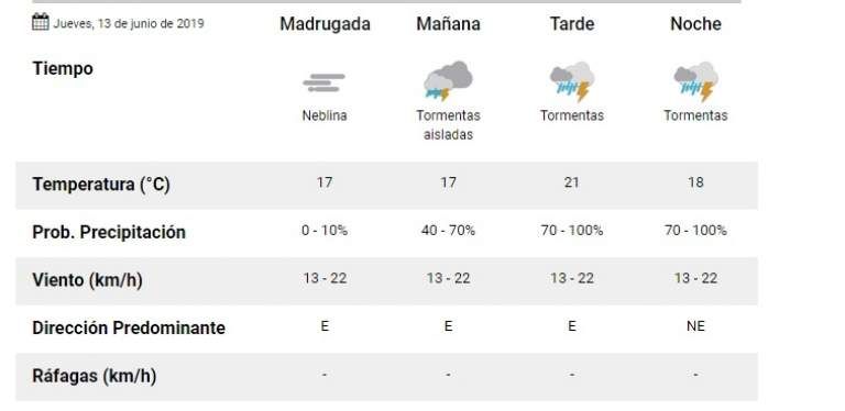 Un jueves hasta con neblina tormentas podríamos tener este jueves en San Juan. Según el Servicio Meteorológico Nacional, tendremos una mínima de 17º, por la mañana; y una máxima de 21º. Durante todo el día habrá una diferencia de 4º. Sin embargo, estima que sobre la mañana habrá neblina; y sobre la tarde y noche, pronosticaron una probabilidad de tormenta. Es decir, tendremos una baja visibilidad. ¡A manejar con cuidado!