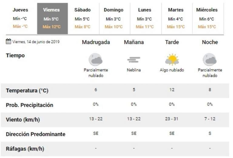 El Sistema Meteorológico Nacional anuncia que el fin de semana en la provincia será apoderado por el frío, las temperaturas máximas no llegarán a ser de 15 grados y las mínimas podrían darse en grados bajo cero en sensación térmica. Además hay anuncios de lluvias aisladas y posibles nevadas en zonas alejadas.
