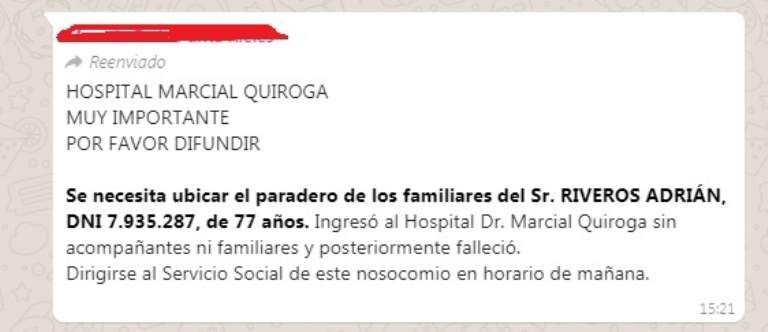 Durante la tarde del martes 18 de junio, circuló por Whatsapp un mensaje que buscaba a parientes del señor Adrián Riveros, de 77 años, quien falleció luego de haber ingresado al Hospital Marcial Quiroga sin acompañantes. A los familiares o a aquellas personas que lo conozcan, se les pide dirigirse al Servicio Social de este nosocomio en horario de mañana.