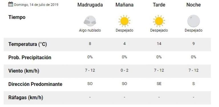 Si bien se pronostica una mínima de 4 grados y una máxima de 14, el Servicio Meteorológico Nacional estima que el mediodía del domingo estará completamente despejado en San Juan. Un momento espectacular para reunirse en familia a almorzar. La mínima llegará en la madrugada y en la siesta-tarde oscilará la máxima pronosticada.