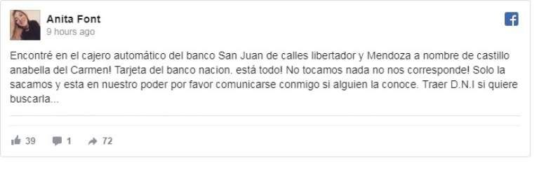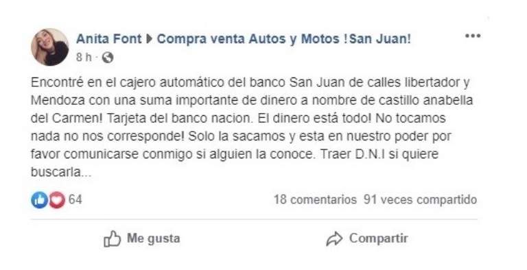 Ana Font es la mujer policía que encontró una cuantiosa suma de dinero en un cajero automático del centro y que ahora busca devolverlo a su dueña. Para poder hallarlos realizó una publicación en su red social de Facebook donde aclara que “el dinero está todo. No tocamos nada, no nos corresponde”, escribió.