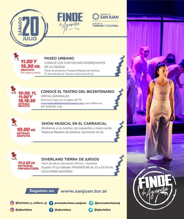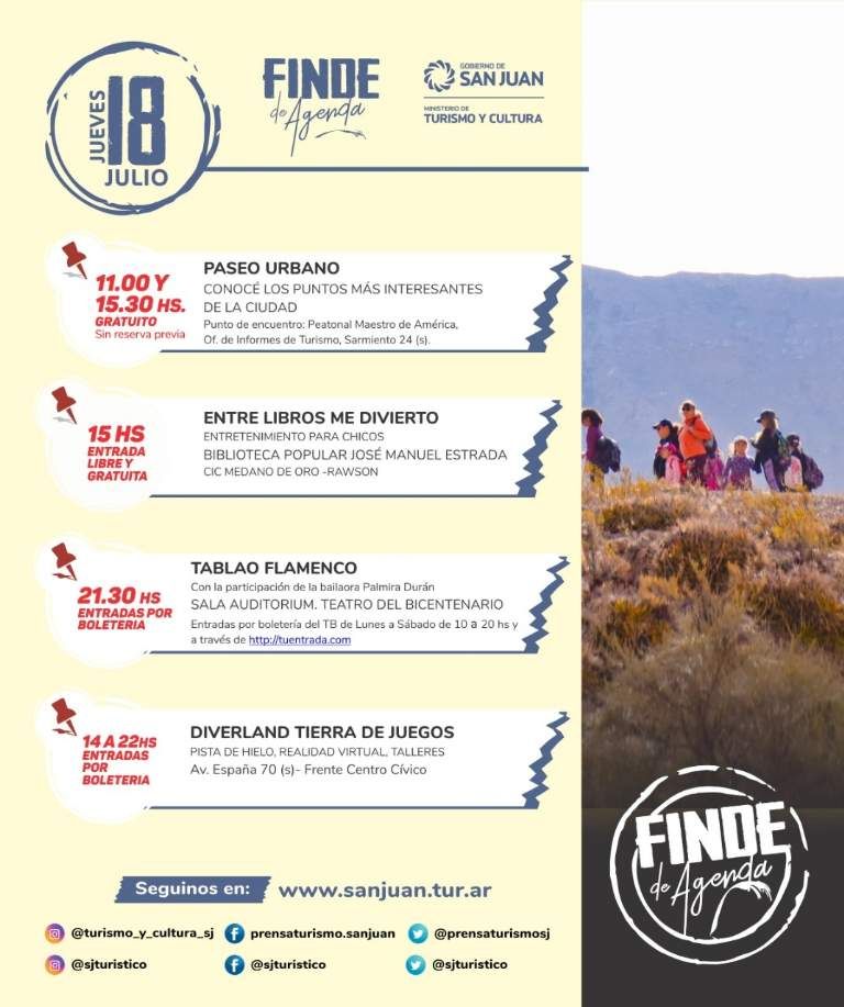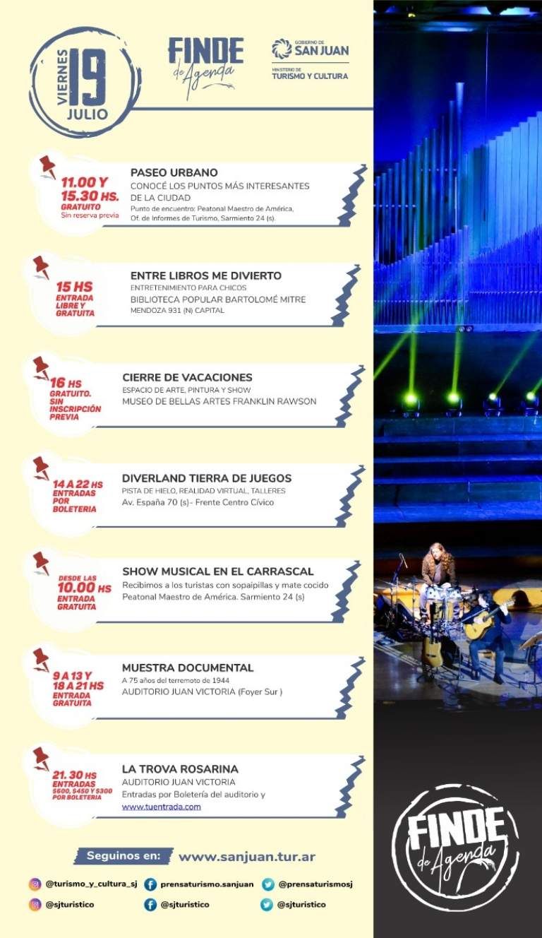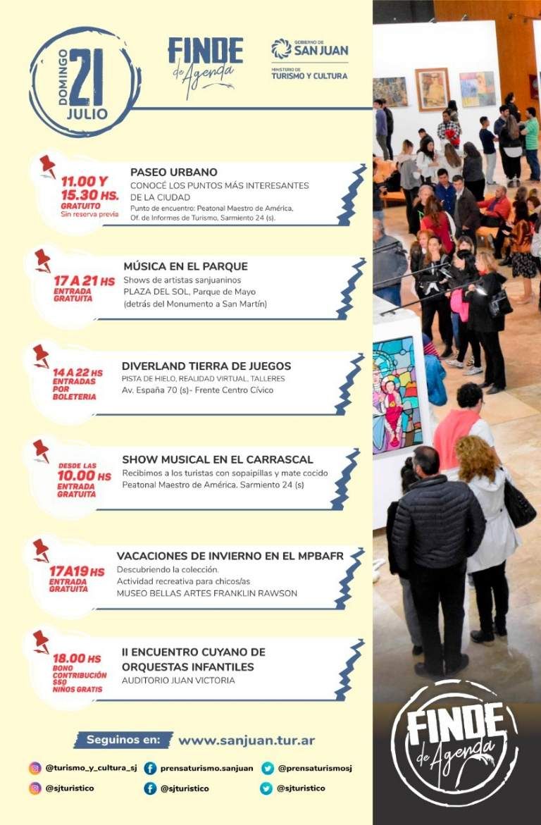 San Juan no se cansa de brindar actividades ideales para disfrutar con la familia y amigos en estas vacaciones de invierno. Y para estos últimos cuatro días que restan del receso escolar, el Ministerio de Turismo y Cultura armó una agenda con propuestas geniales y imperdibles: