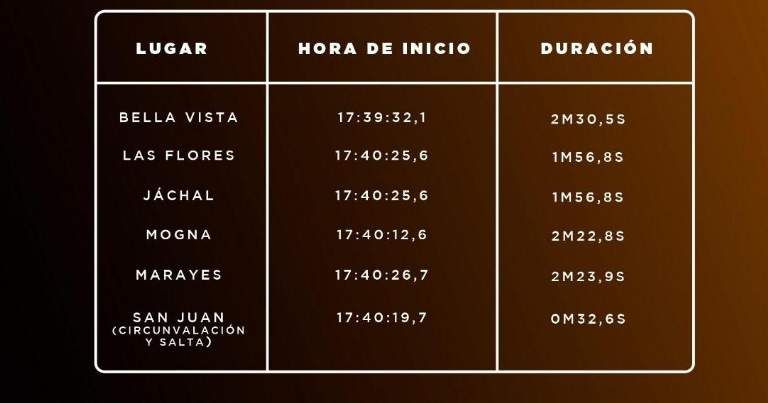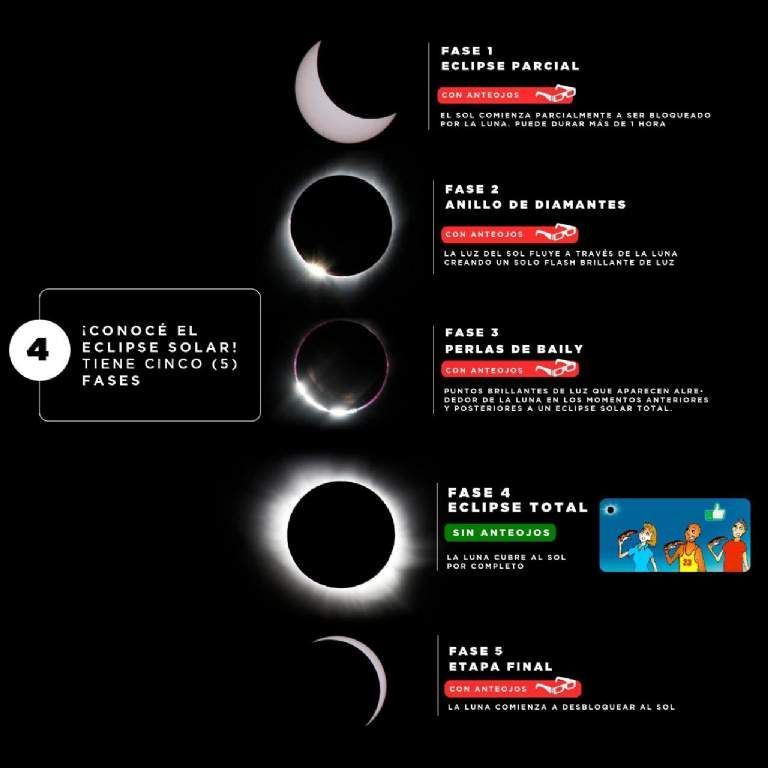 Entre medio minuto o dos minutos y medio puede durar la observación del eclipse total de sol, dependiendo de qué punto elijas para mirarlo dentro de la franja determinada, desde los departamentos cordilleranos hasta Salta y Circunvalación. En el siguiente gráfico figura en los puntos de observación plena a qué hora se iniciará el fenómeno y cuánto durará. Esto, porque el suceso se desarrollará durante más de dos horas pero la fase de oscurecimiento total es muy corta, Siempre tené en cuenta las recomendaciones de cómo admirar el suceso, con lentes especiales autorizados.