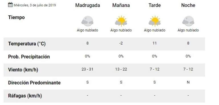 Según el Servicio Meteorológico Nacional, se nos viene un miércoles con mucho frío. Tendremos una mínima de -2º -por la mañana- y una máxima de 11º, en horas de la siesta. Será un día para abrigarse bastante si tienen pensado salir a la calle.