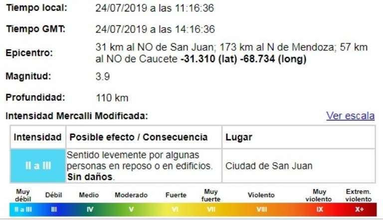 Pasadas las 11 de la mañana un fuerte sismo sacudió el suelo sanjuanino y es el segundo en menos de 24 horas que sobrepasa la magnitud de los 3.5 grados El de este martes en la siesta fue de 4.1 y el de ahora fue de 3.9 de intensidad en la escala Mercalli.