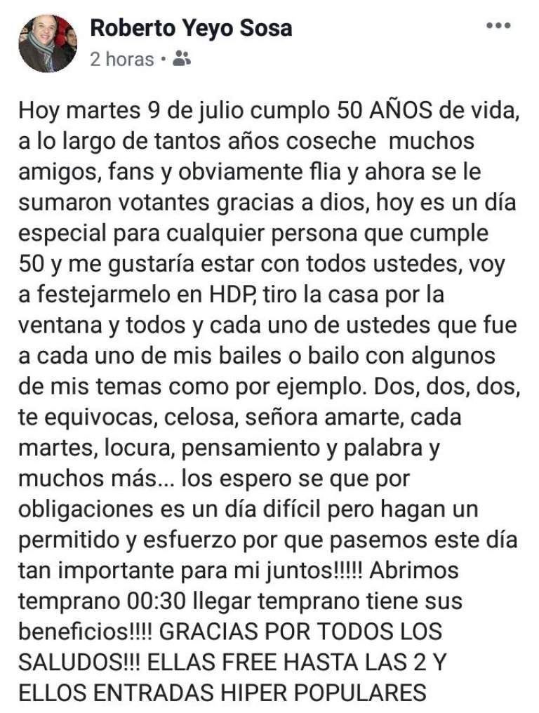 Roberto "Yeyo" Sosa es un conocido cantante sanjuanino, número uno de la movida tropical local. El ínterprete recibió las cinco décadas rodeado de cariño no sólo de su familia sino también de sus fans, que lo acompañan adonde vaya. Para agradecer tantas demostraciones de afecto, hizo un posteo en Facebook.