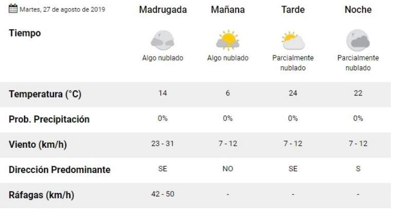 Según el Servicio Meteorológico Nacional, para este martes la temperatura máxima alcanzará 24º y la mínima 6º. Según el organismo, en horas de la madrugada vendrá un viento desde el sector sudeste con ráfagas que alcanzarán los 50 kilómetros por hora. En horas de la mañana y de la tarde, la intensidad del viento disminuirá.