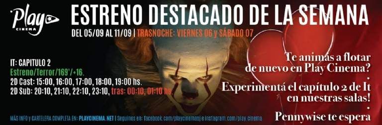 Play Cinema (Patio Alvear) se viste de gala una vez más para el estreno mundial de IT 2, la segunda parte del aterrador éxito. En esa oportunidad, como no podía ser de otra manera, la estelar presentación estará acompañada de varias sorpresas que no podrás creer.