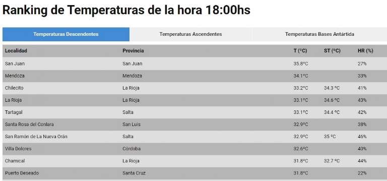 El termómetro volvió a posicionar a San Juan en el primer puesto del ranking de las provincias más calurosas del país. Sobre las 18 de este jueves 2 de enero, el Servicio Meteorológico Nacional confirmó que con 35.8º superó a Mendoza y a La Rioja (Chilecito), que lo siguieron con 34.1º y 33,2º, respectivamente.
