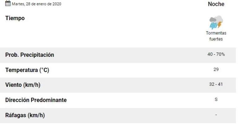 Tal como lo había adelantado este medio, continúa el alerta meteorológica sobre la posible llegada de tormentas para la noche de este martes. Así lo publicó el Servicio Meteorológico Nacional en su página oficial. Hay una probabilidad del 70% de la llegada de lluvias. La temperatura estará bastante agradable: en unos 29º.