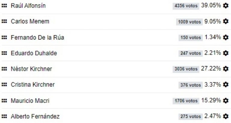 11.191 Alberto Fernández hace unos días dijo que el mejor presidente que había tenido la Argentina con el retorno de la democracia había sido Nestor Kirchner. Tiempo de San Juan hizo una encuesta preguntando quién fue el mejor presidente a lo largo de este periodo y el ganador fue Raúl Alfonsín con el 39 por ciento de los votos. En total 11.191 personas participaron en esta encuesta.